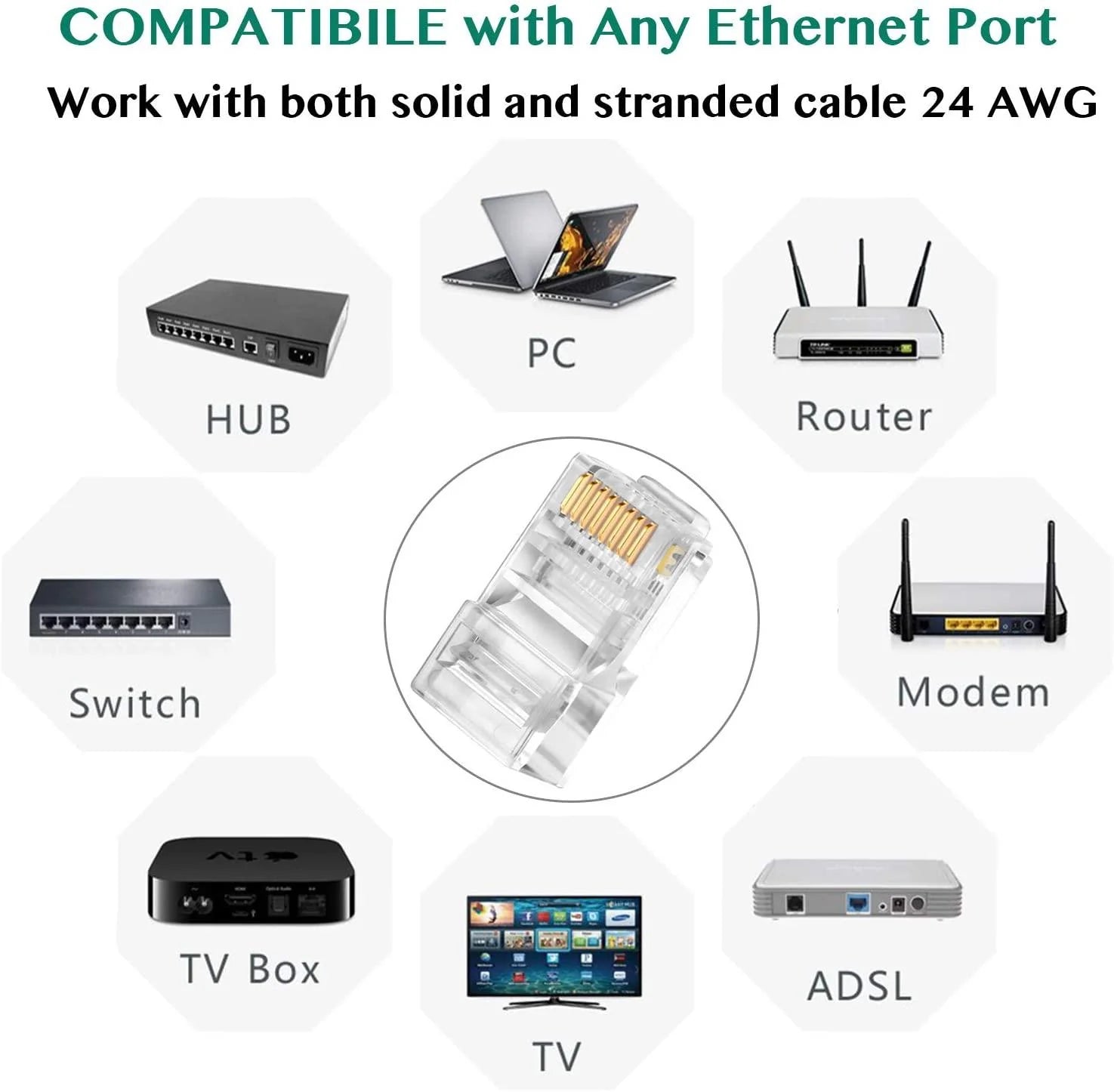Broad Compatibility for Professional Installations: These RJ45 pass-through connectors are engineered for use with Cat6A and Cat7 round Ethernet cables, supporting 23 to 24 AWG solid or stranded conductors. Designed to work with most RJ45 crimping tools and Cat6 keystone jacks.
