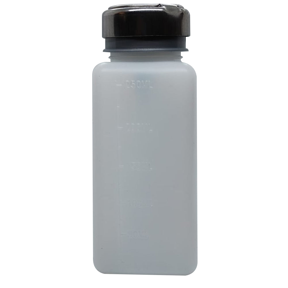 Durable plastic dispenser bottle with a secure white metal cap for controlled liquid dispensing.